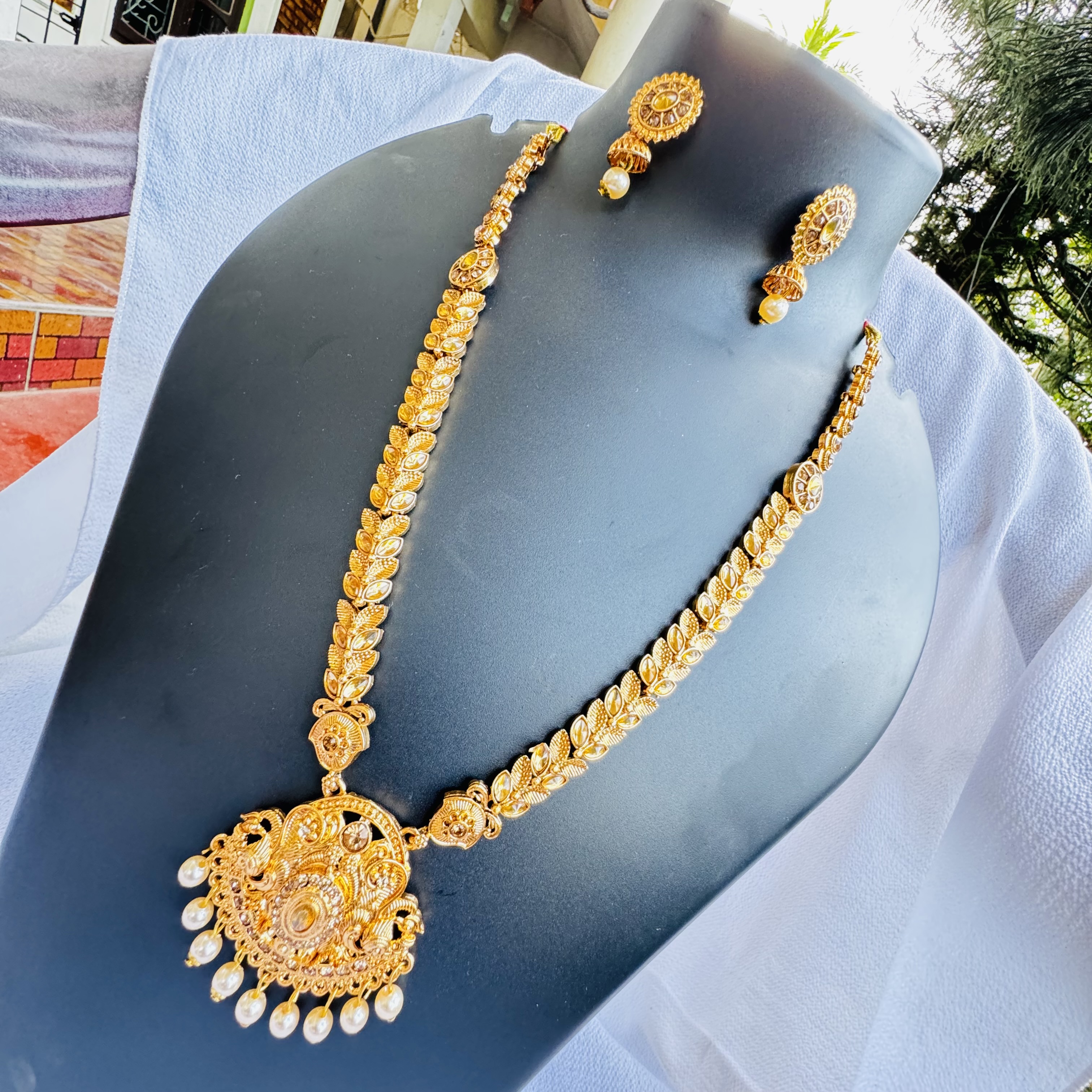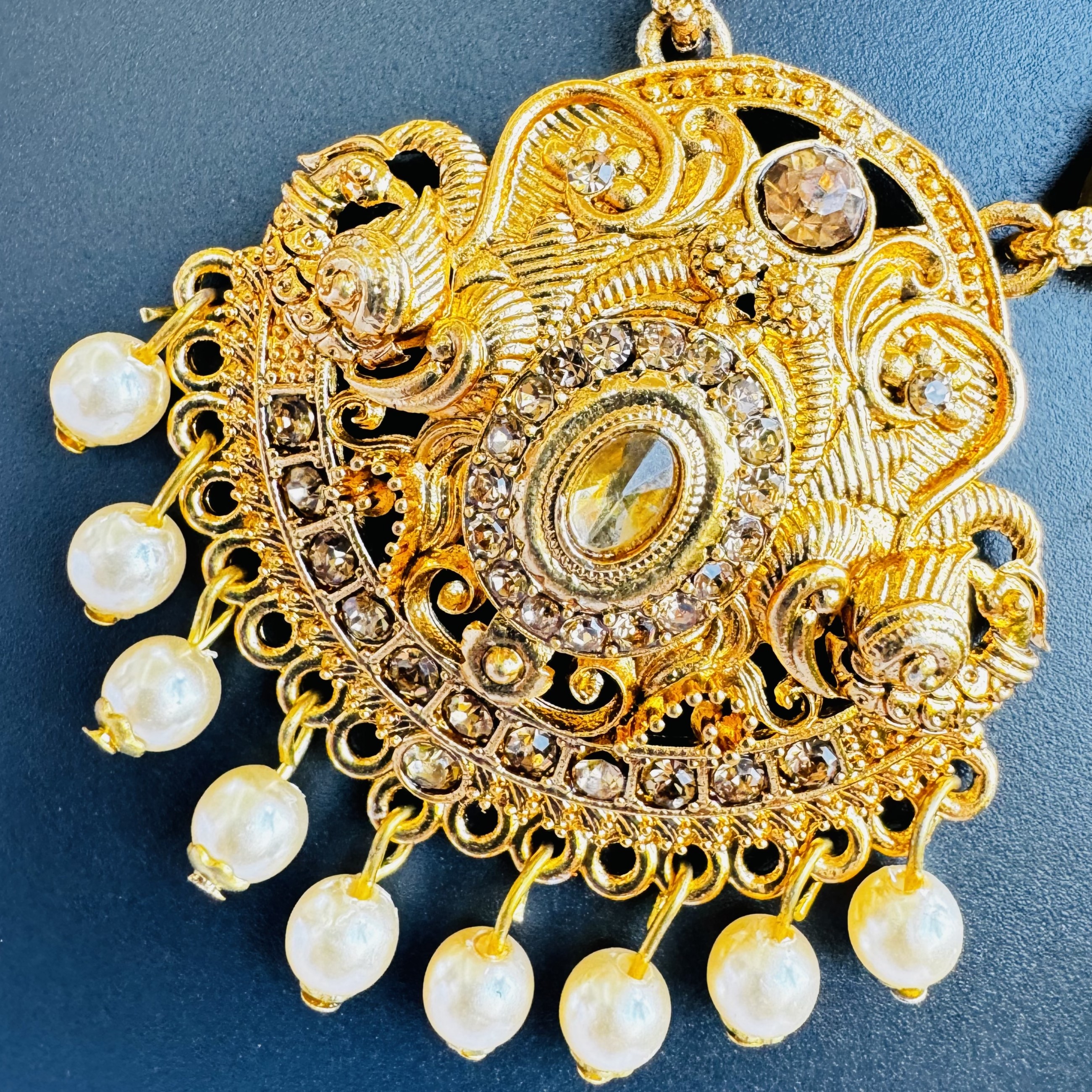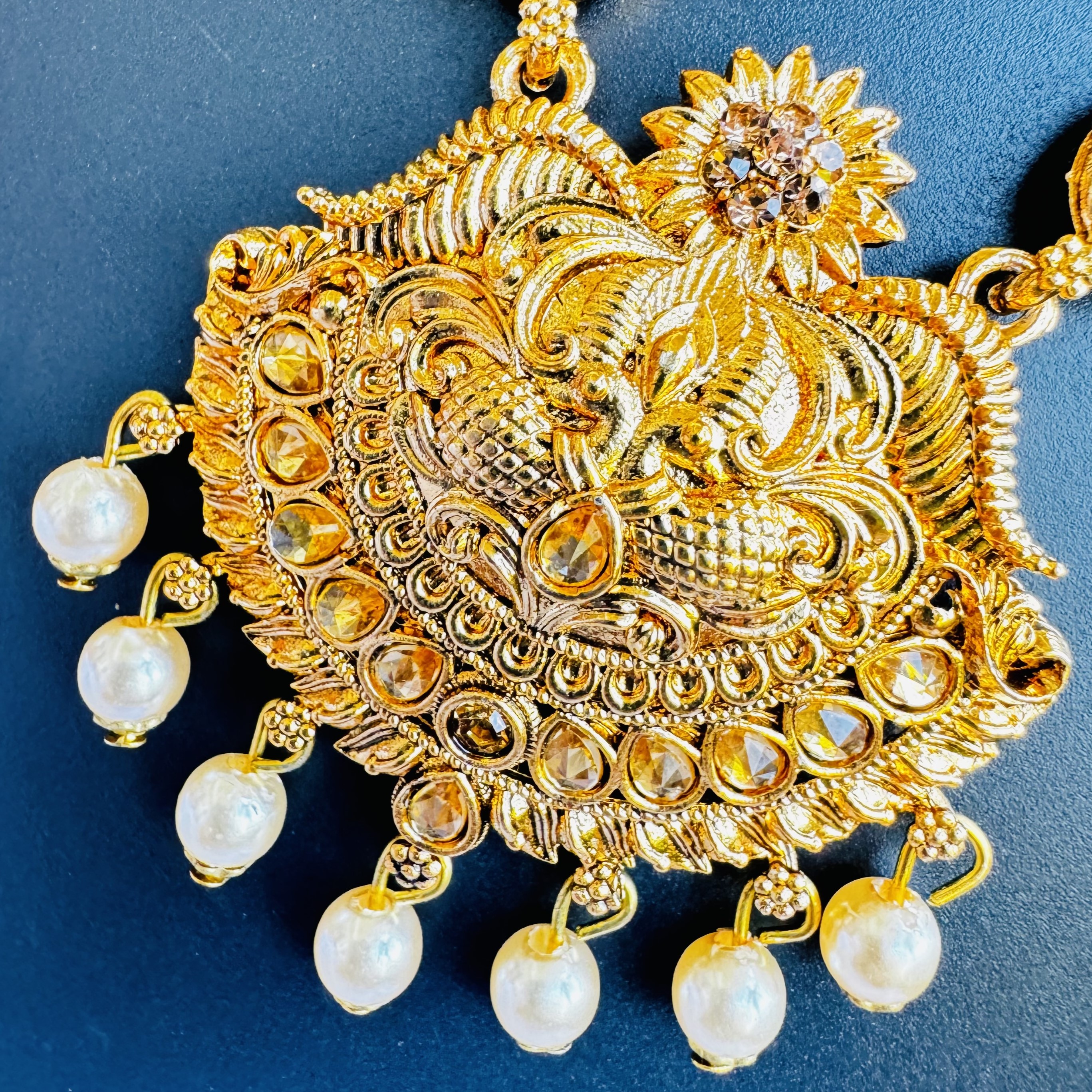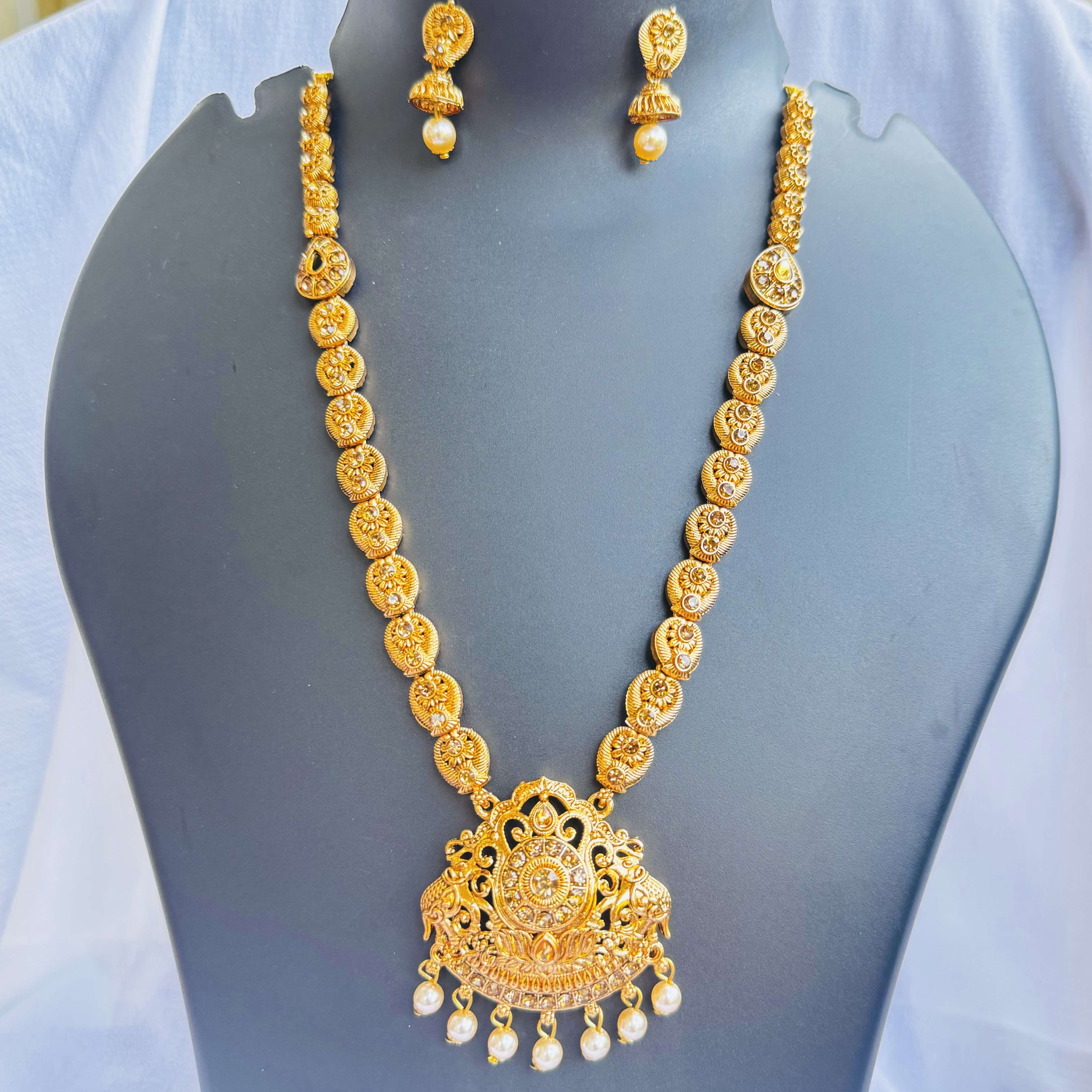 Excellent jewelry set is made out of Brass with high quality gold-plating. This Temple theme piece is studded with opulent gold cubic zirconia stones and induced pearls.