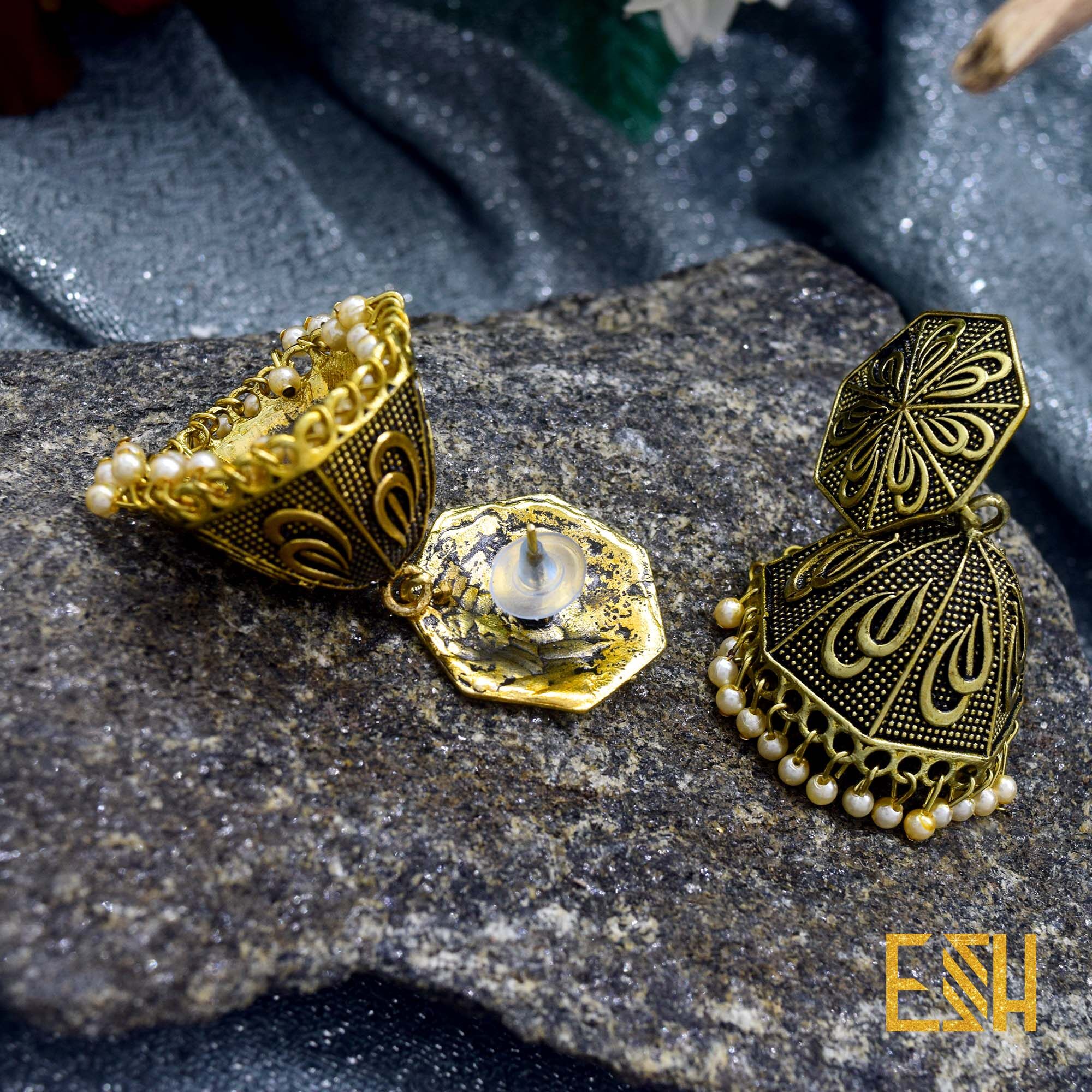 Dull Gold Plated Jimikki Fashion Durable Earrings Atapattam Design With Pearl For Women & Girl