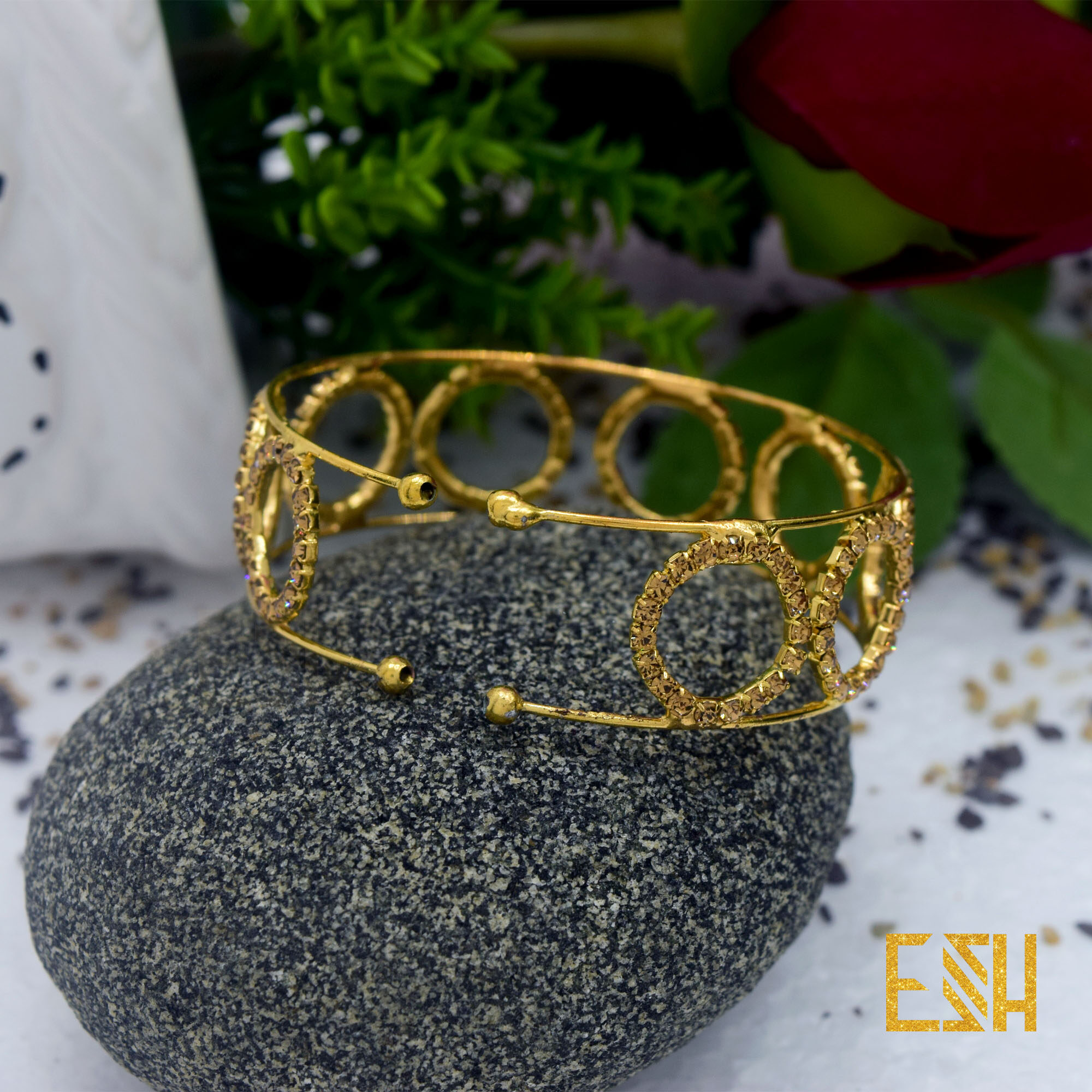 ESH Fancy Gold New Arrived Free Size Big Bangle Bracelet With Full White Stone For Women Gift ( Fit For Any Hand )