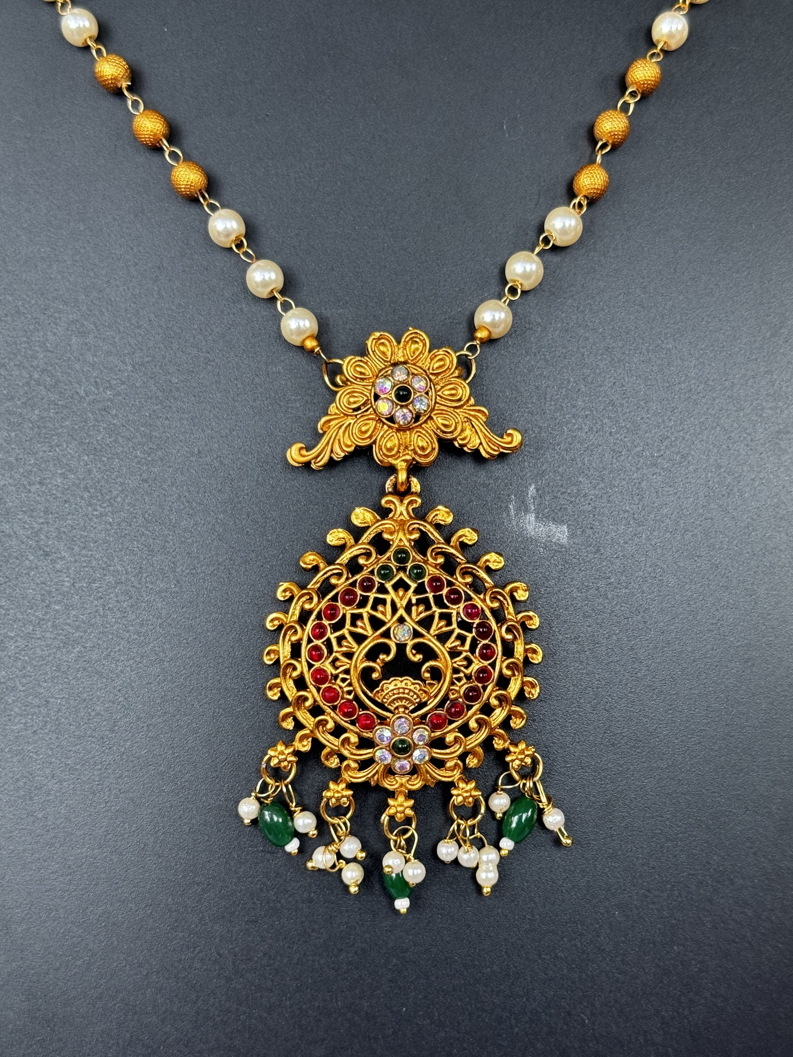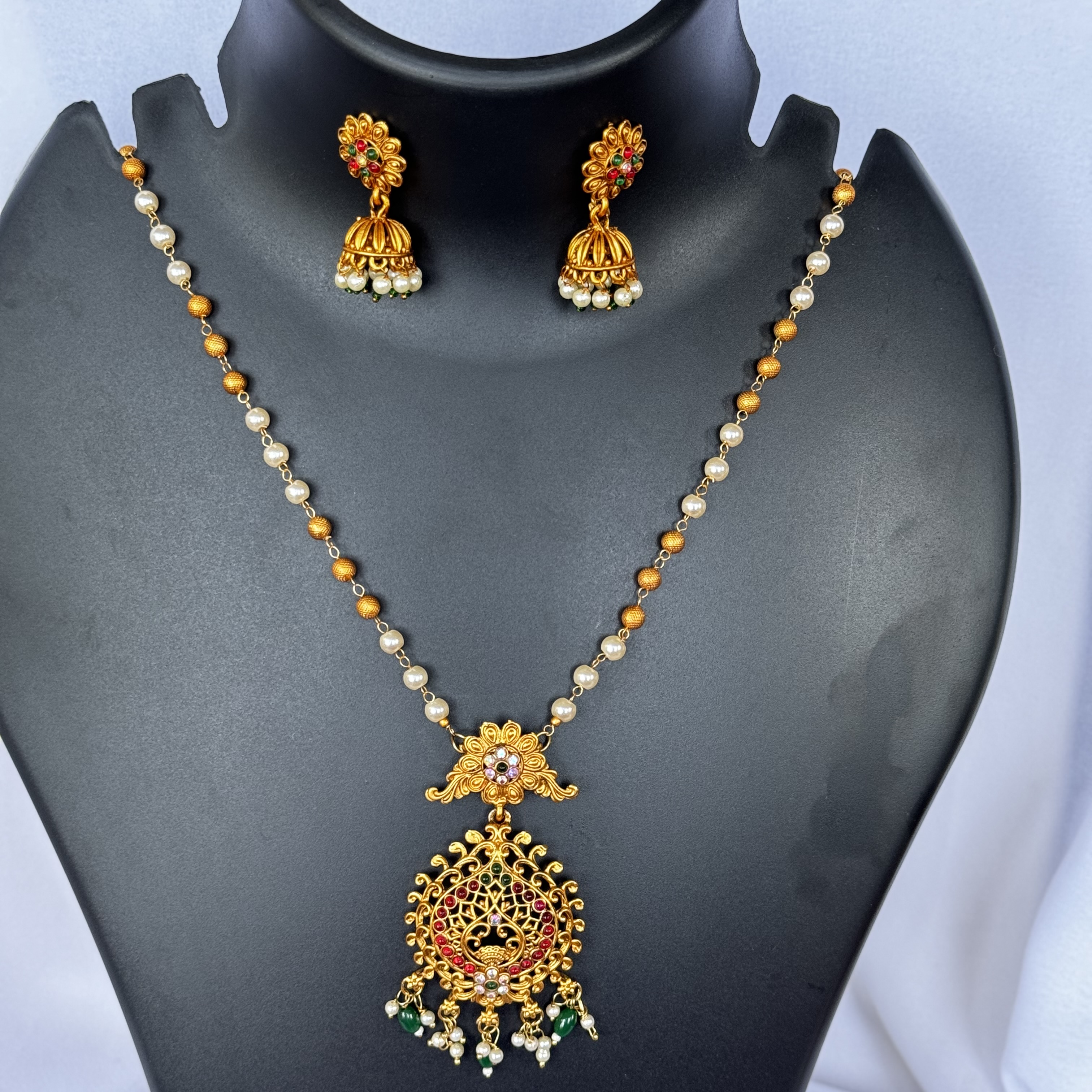 Excellent jewelry set is made out of Brass with high quality gold-plating. This Temple theme piece is studded with opulent gold cubic zirconia stones and induced pearls.