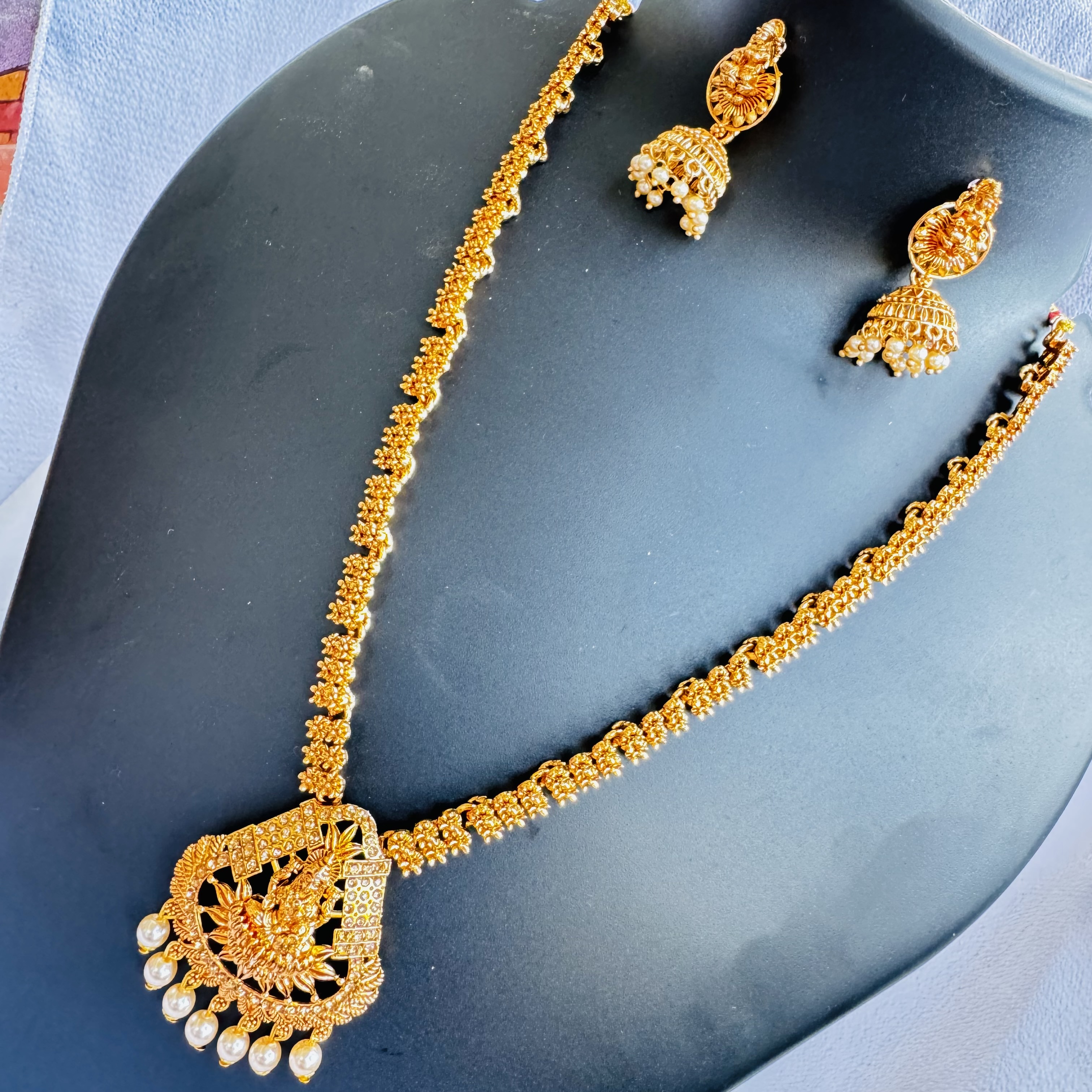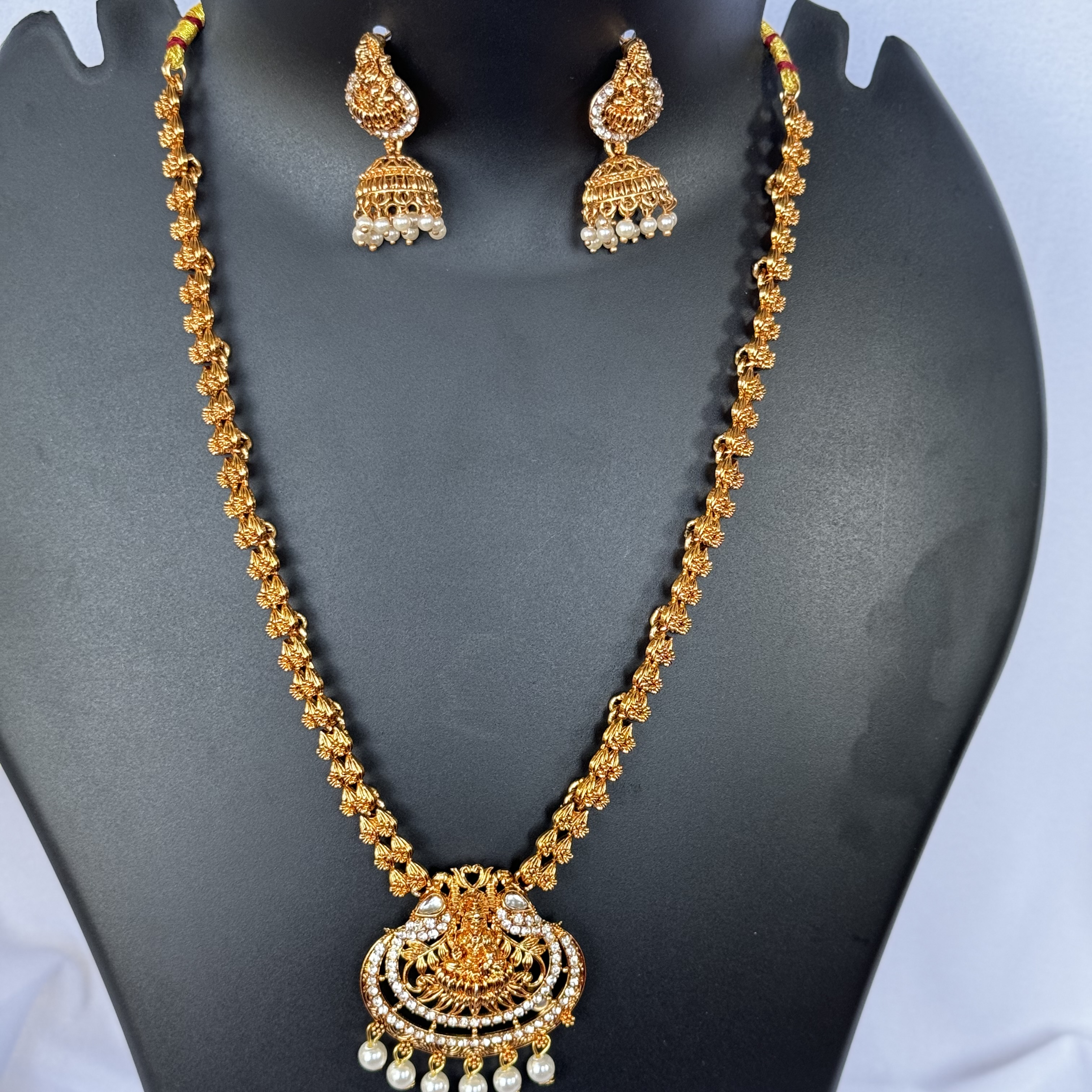 Gold color temple design long necklace set with silver color stone and off-white pearl for women and girl