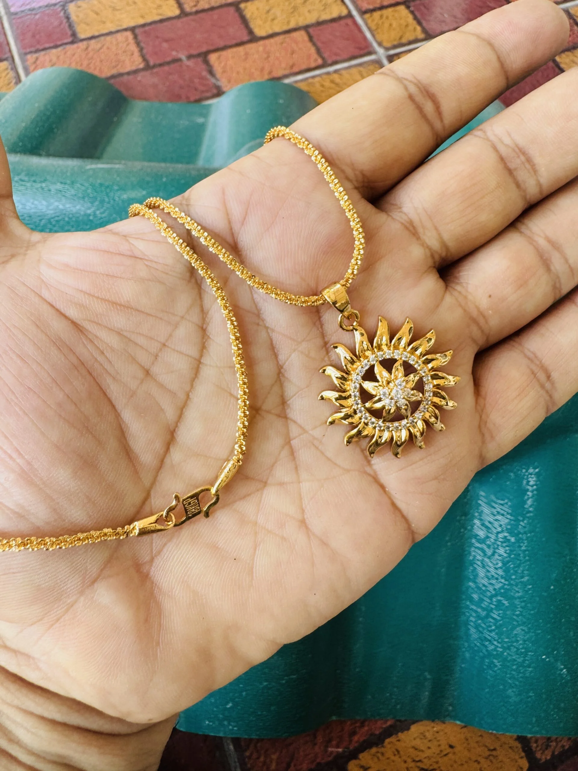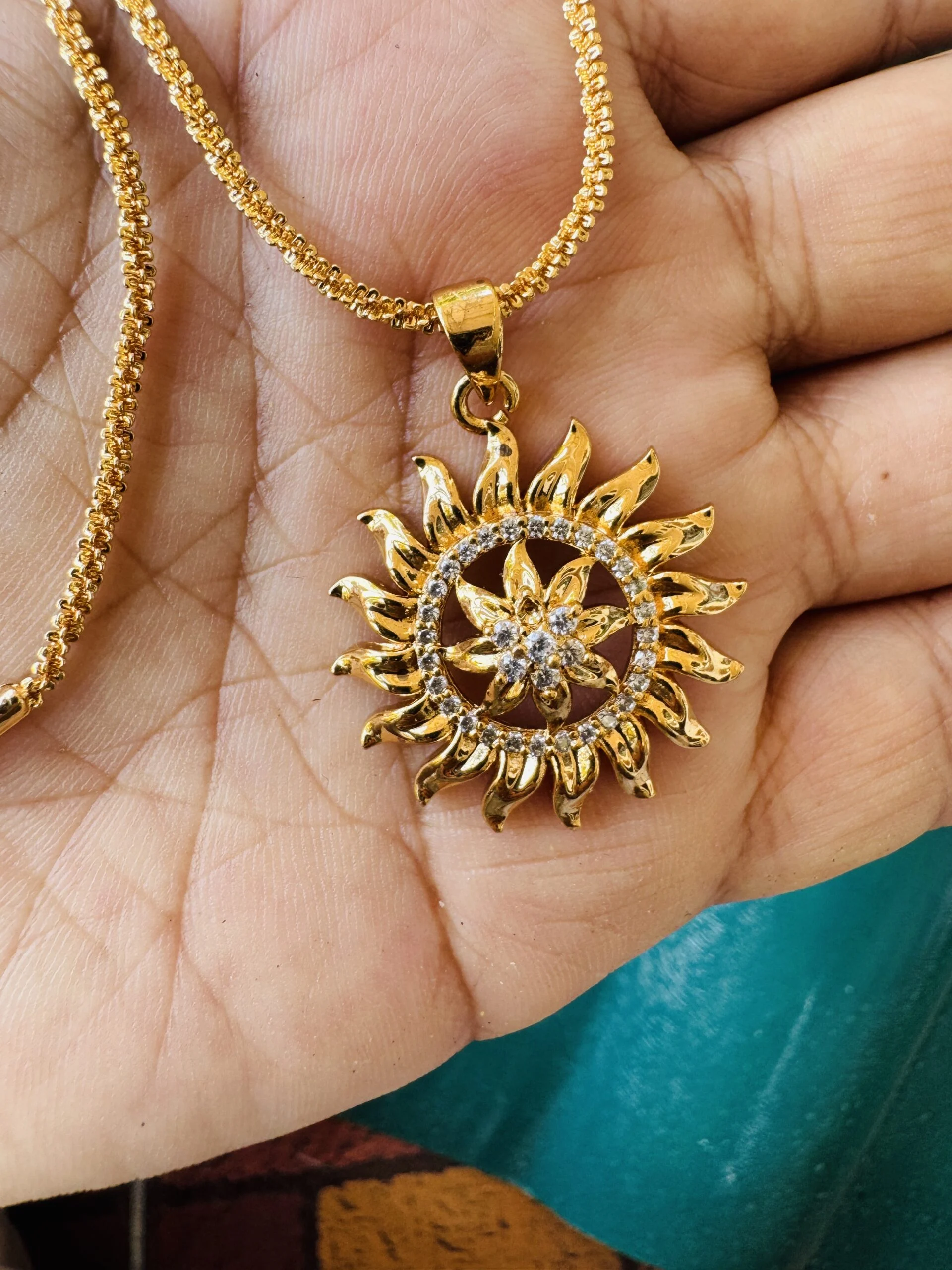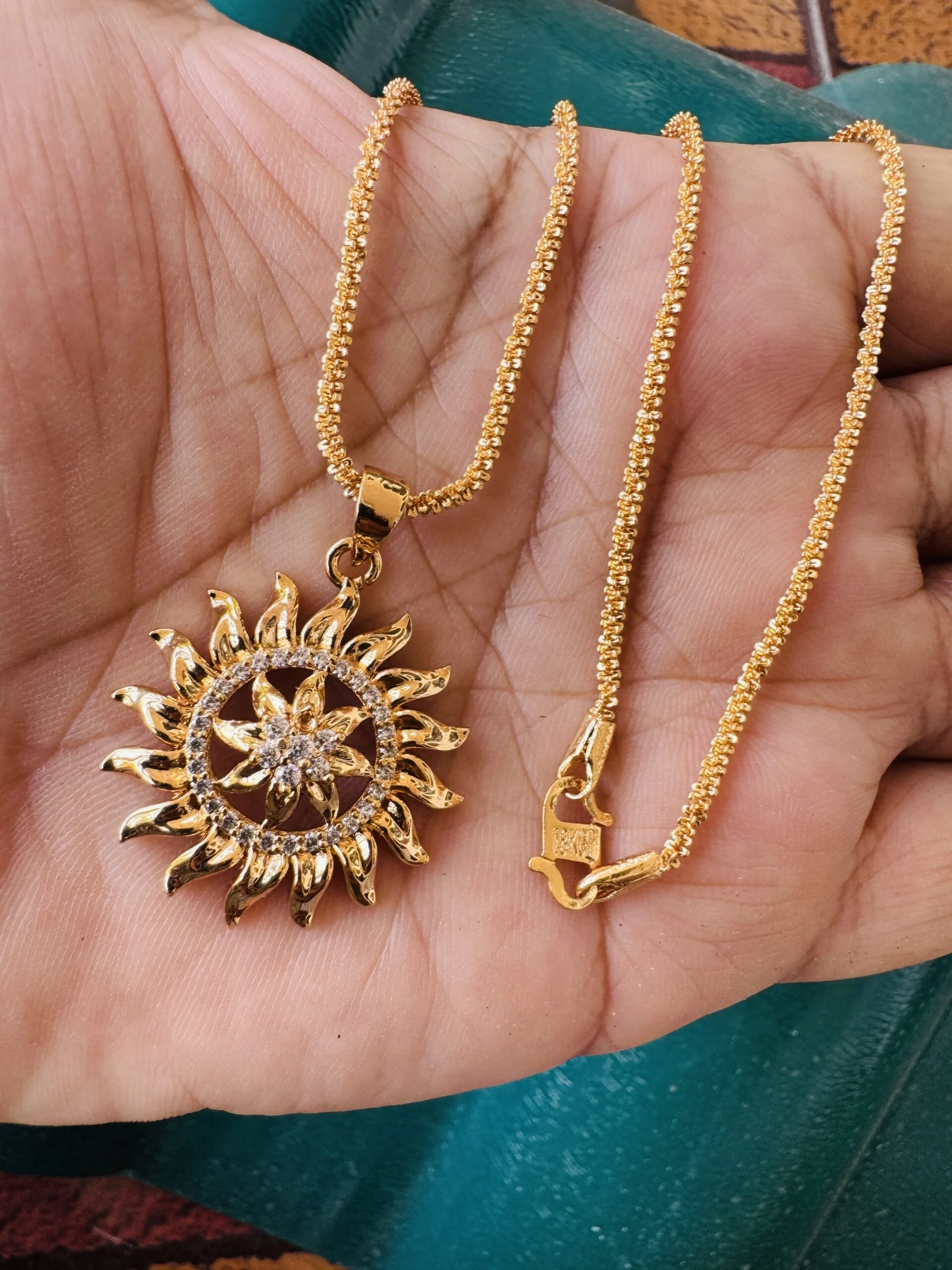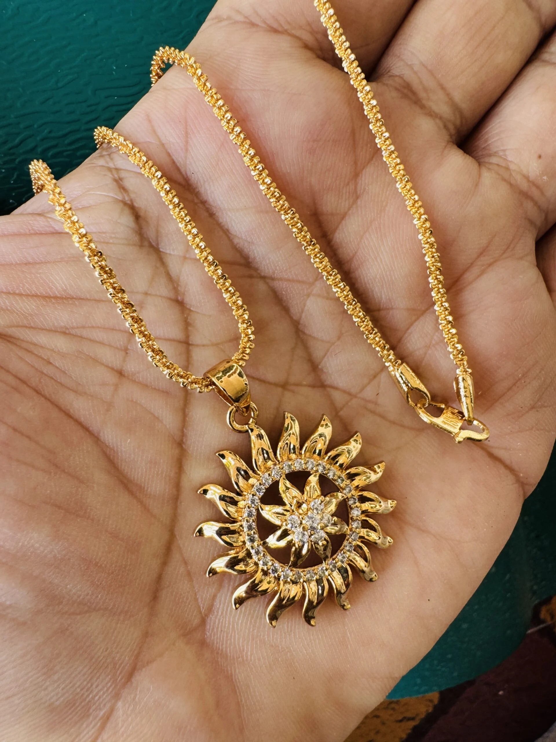 Gold plated 18/24 Inch Twice rope 1.5 mm chain and Sun design large pendant with white stone for women & girl