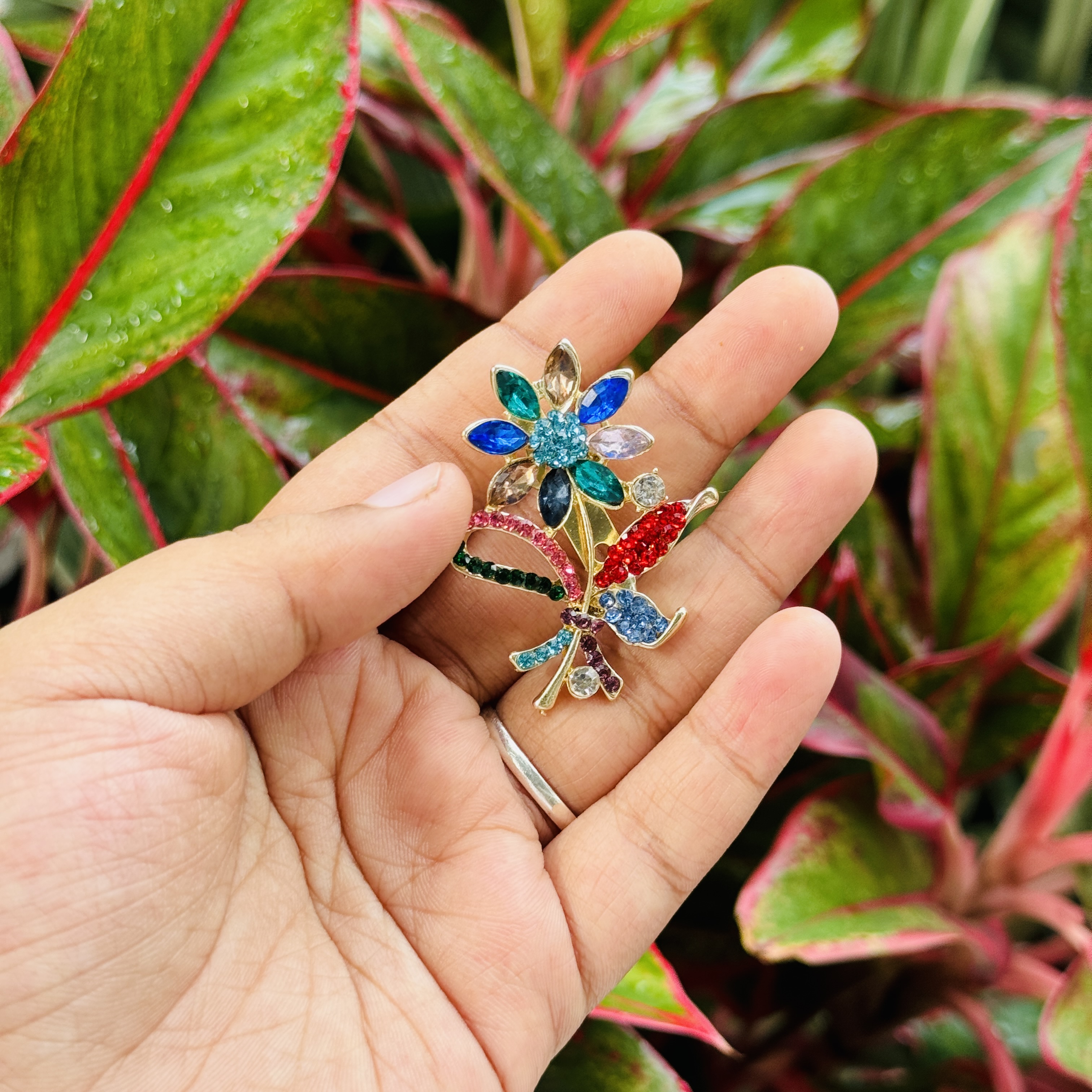 Light gold color very beautiful sunflower design saree brooch with dark and light multi color stone for women