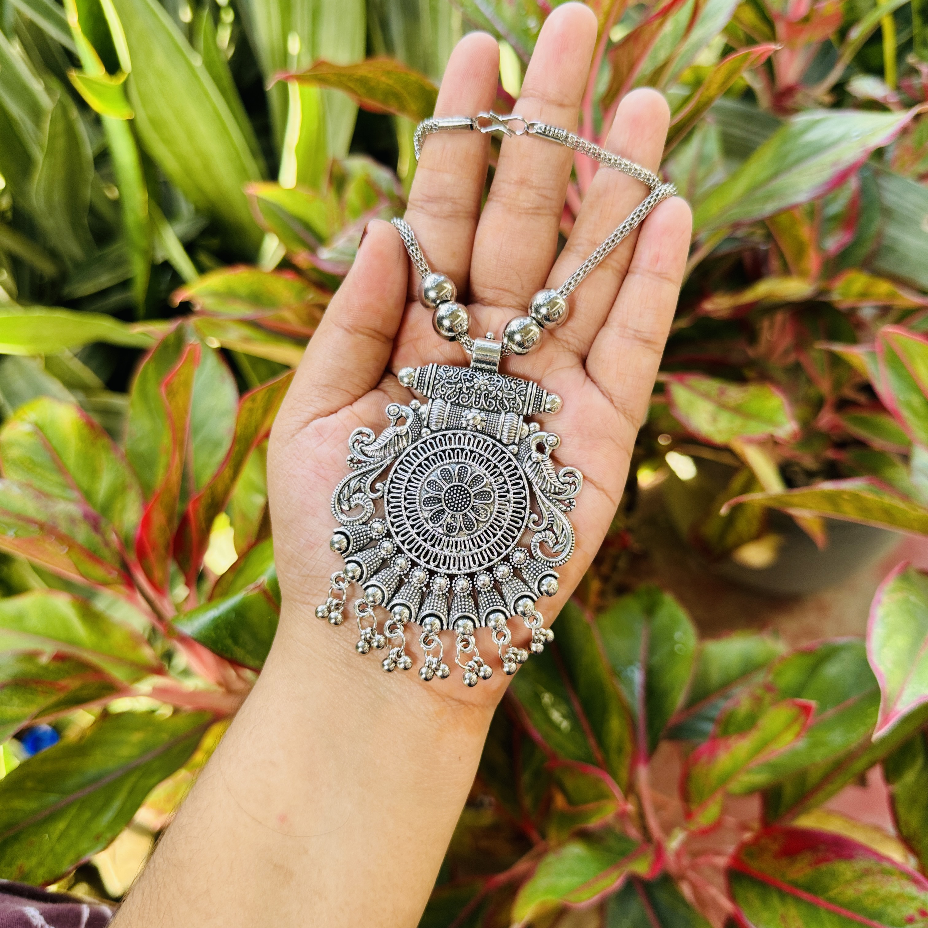 Oxidize Silver color 20-inch short chain with full Flower theme antic look big pendent with stone and silver beaded necklace for women and girl Original price was: Rs. 1,100.00.Current price is: Rs. 690.00.