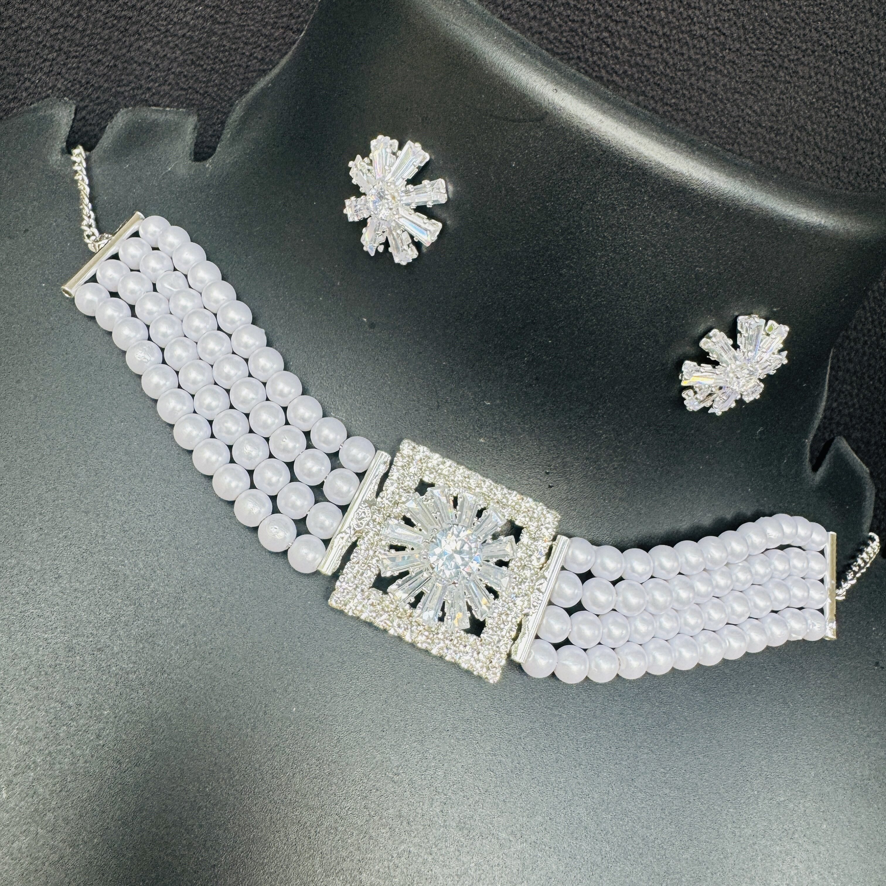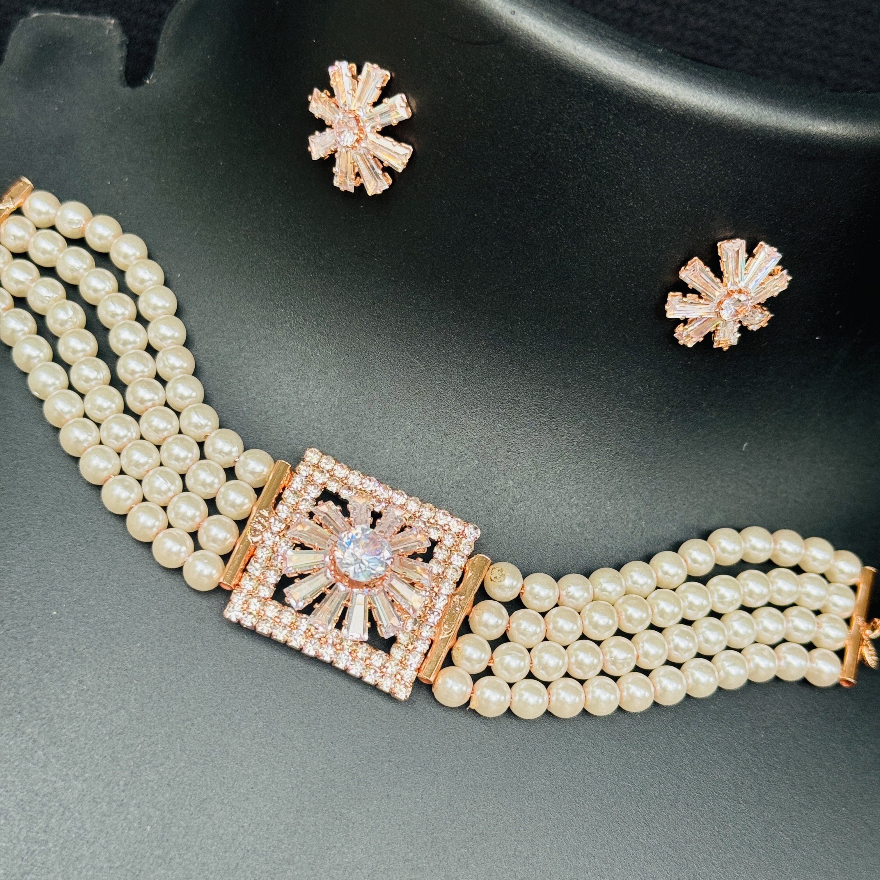 Rose gold and silver color white pearl beautiful Short choker necklace set with Cz Cubic Zirconia Beaded stone pendent for women and girl