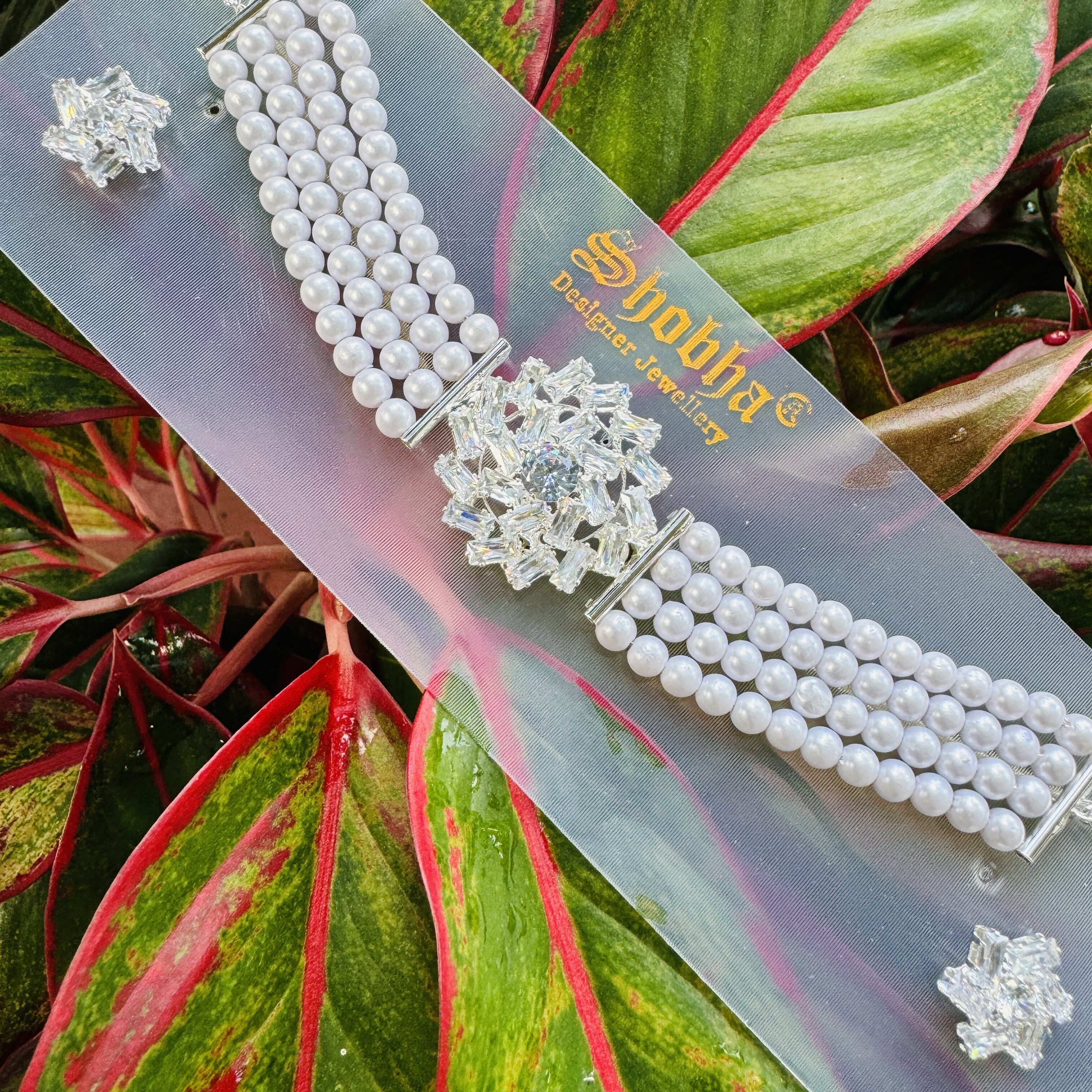 Silver color white pearl beautiful Short choker necklace set with Cz Cubic Zirconia Beaded stone pendent for women and girl