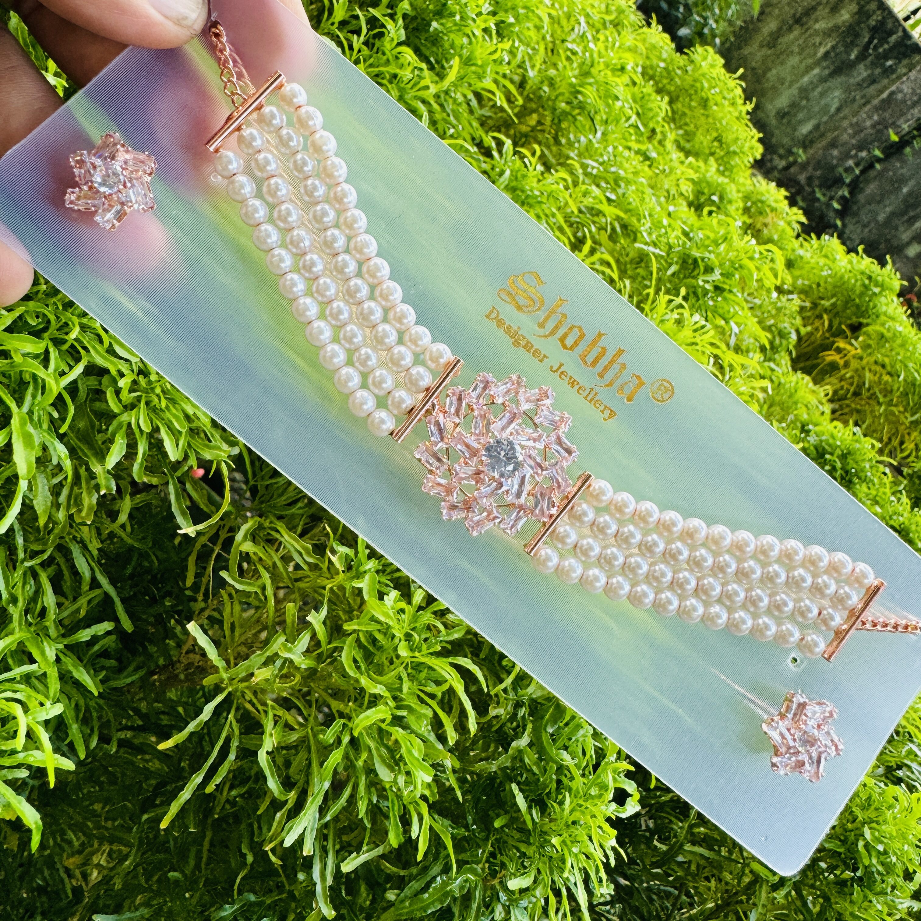 Rose gold and silver color white pearl beautiful Short choker necklace set with Cz Cubic Zirconia Beaded stone pendent for women and girl