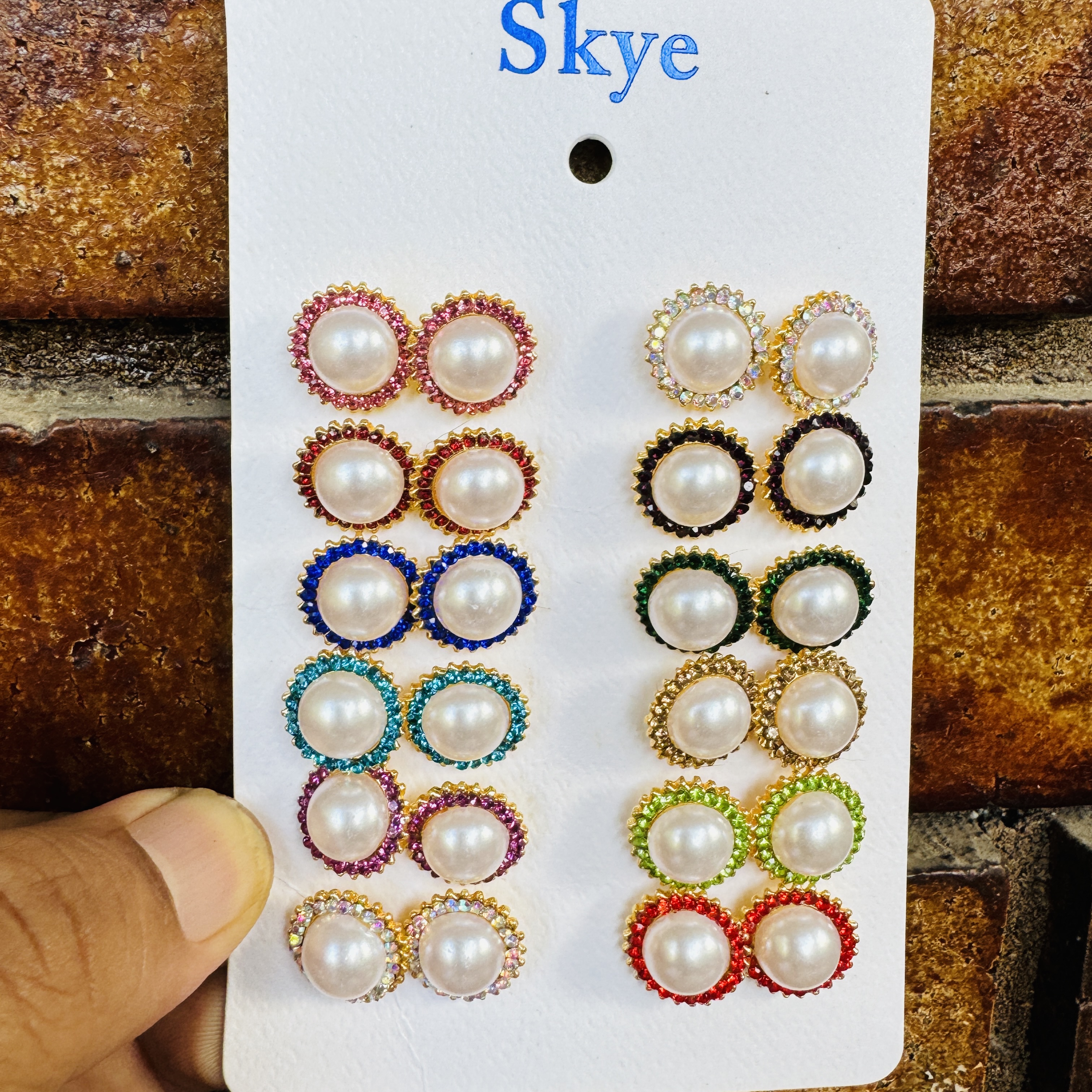 Rose gold color big round pearl stud earring with red, maroon, blue, green, black, gold color stone for women and girl